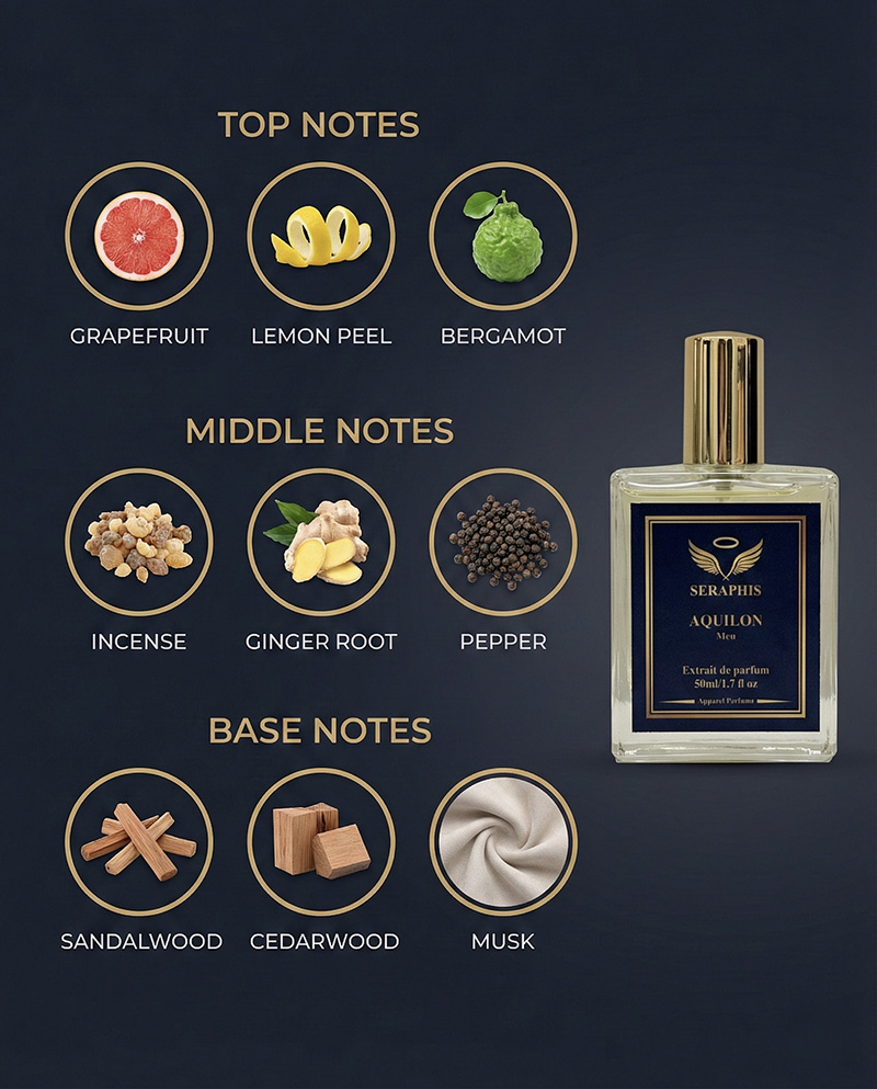 AQUILON by Seraphis expresses the beauty of effortless elegance. The fragrance opens with bright fresh notes that feel crisp and refined, creating an immediate sense of clarity and confidence.