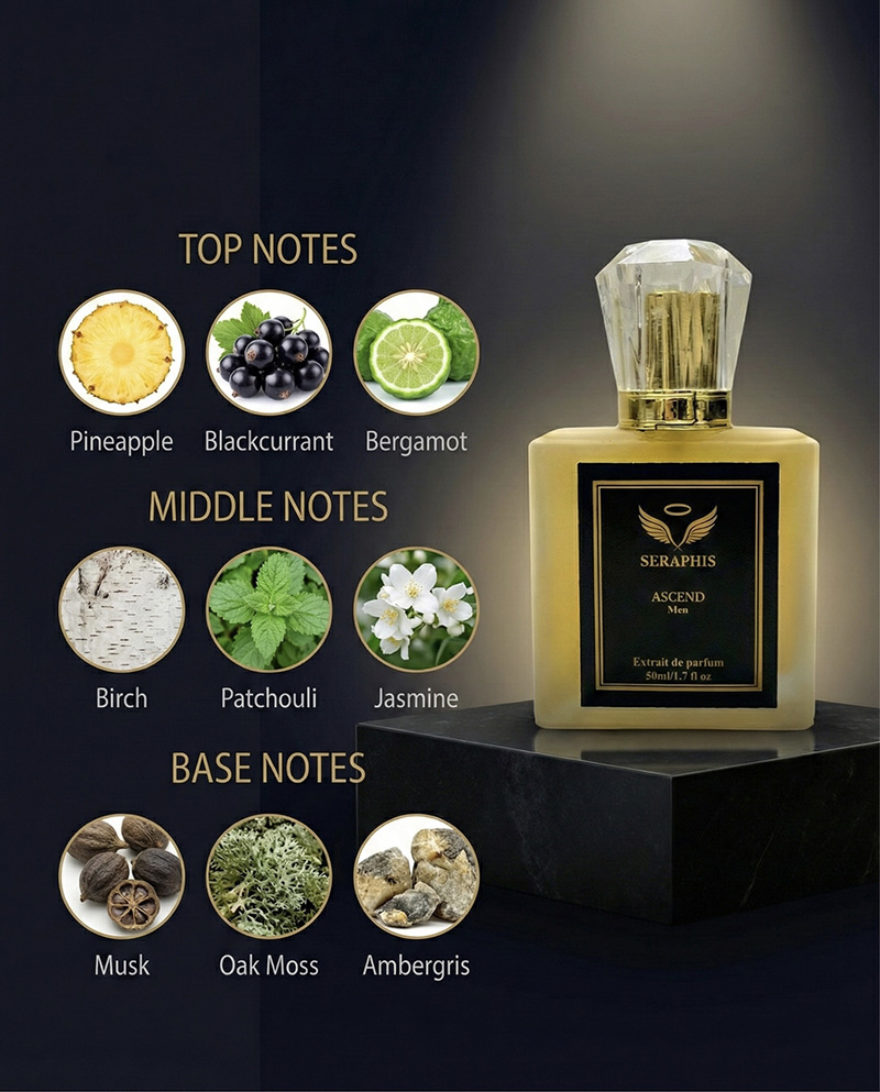 ASCEND by Seraphis captures the energy of ambition and unstoppable drive. The fragrance opens with vibrant fruity freshness that instantly commands attention and creates a bold first impression.